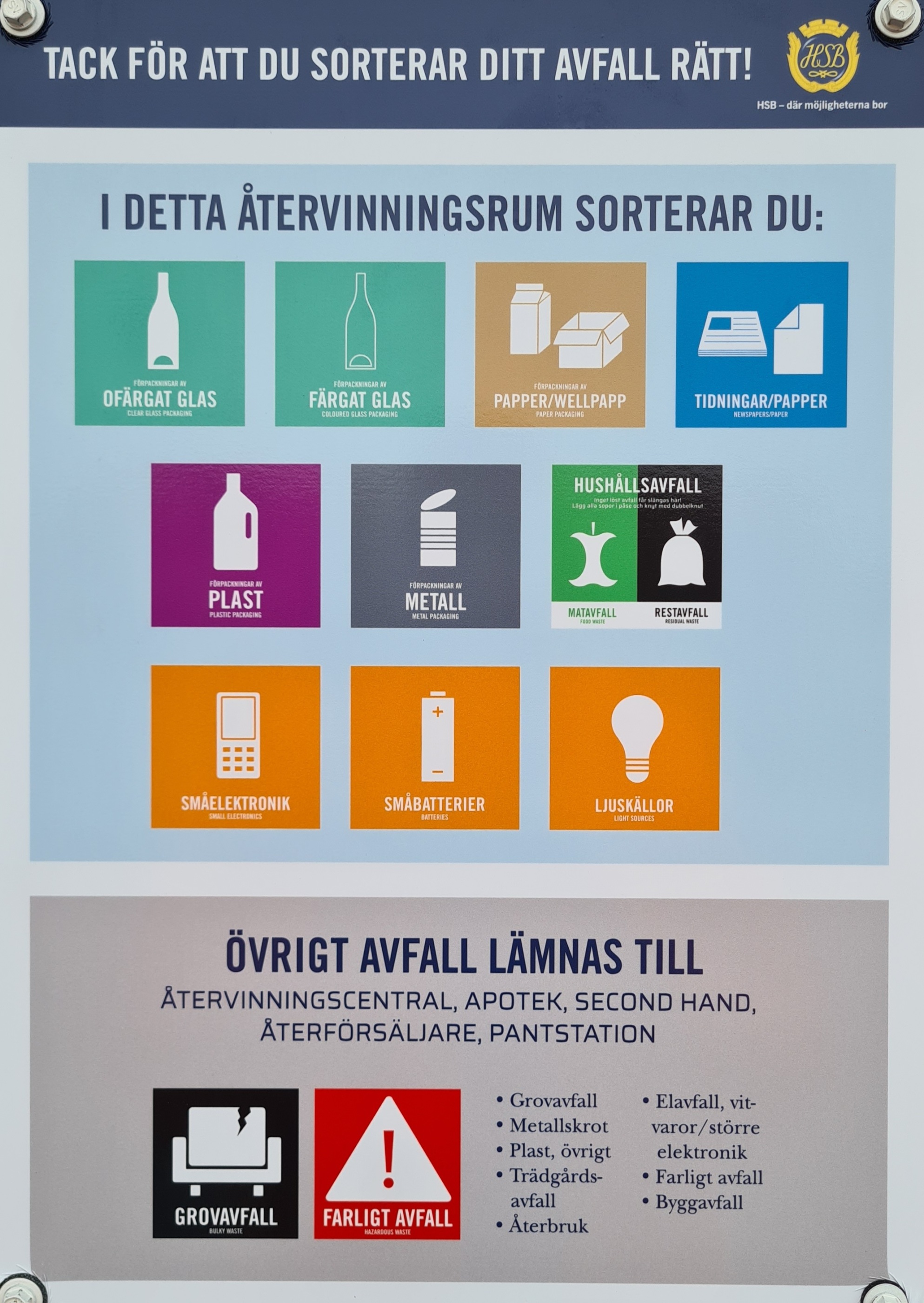 I sop- och återvinningsrummet, som ligger vid nedre garagen, alldeles bredvid hissen, finns behållare för grovavfall. Här skall kartonger, plast, plåtburkar, glas, tidningar m.m. som inte är att betrakta som hushållssopor slängas. Sopor som slängs i behållarna skall sammanpackas och behållarna får ej fyllas mer än till överkant.